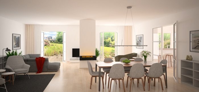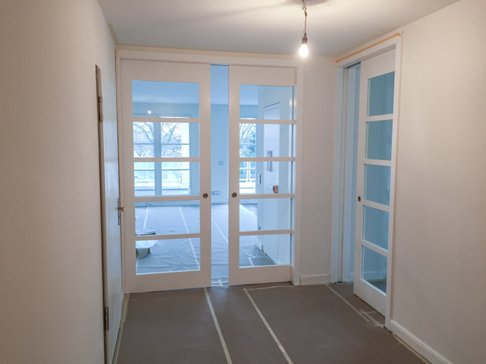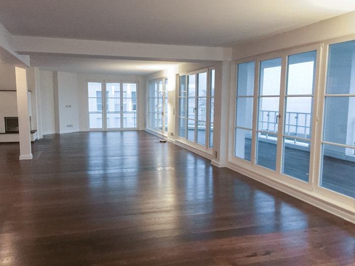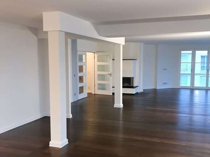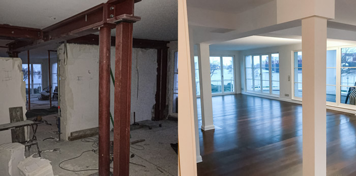 UmbauProjektart: Um den Wohnraum zu vergrößern wurden zwei Eigentumswohnungen zusammengelegt. Aufgrund der massiven Wohnungstrennwand musste der Durchbruch mit einem massiven Unterzug und Stahlstützen abgefangen werden.