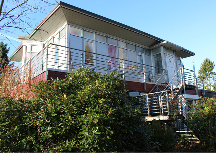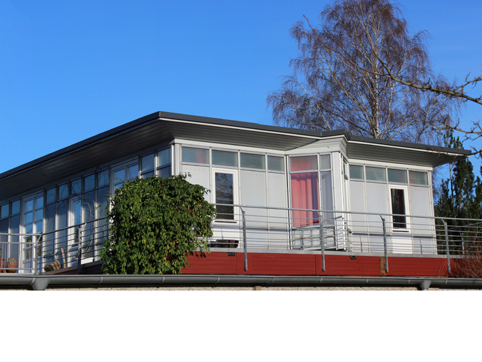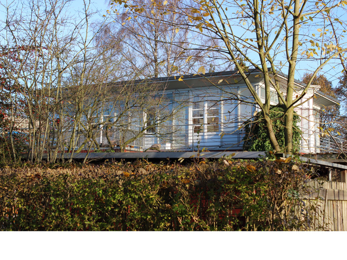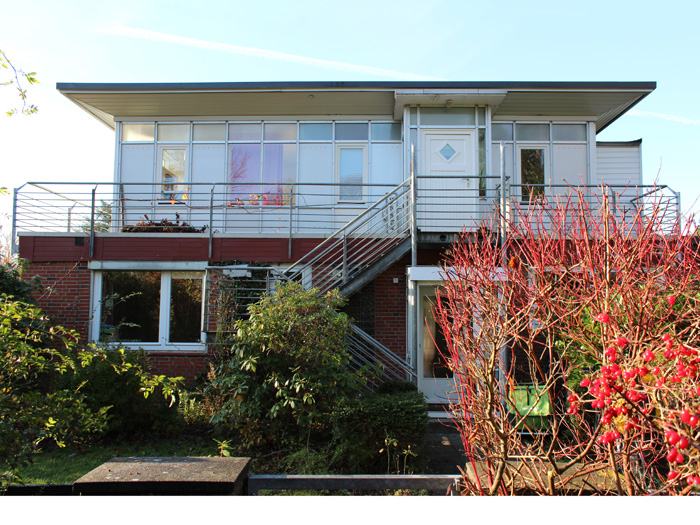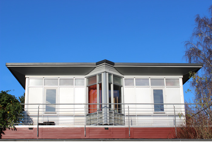 AufstockungProjektart: Um den eingeschossigen Bungalow mit einer zweiten Wohnung zu erweitern, wurde dieser aufgestockt. Das neue Dachgeschoss wird durch eine neue Außentreppe erschlossen.
