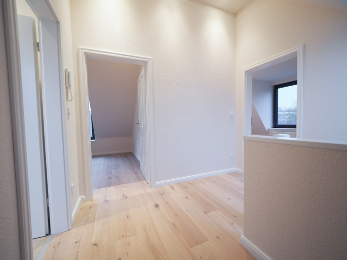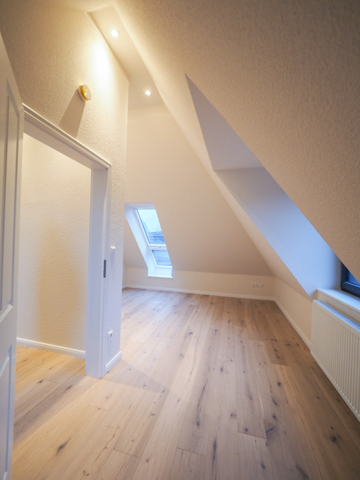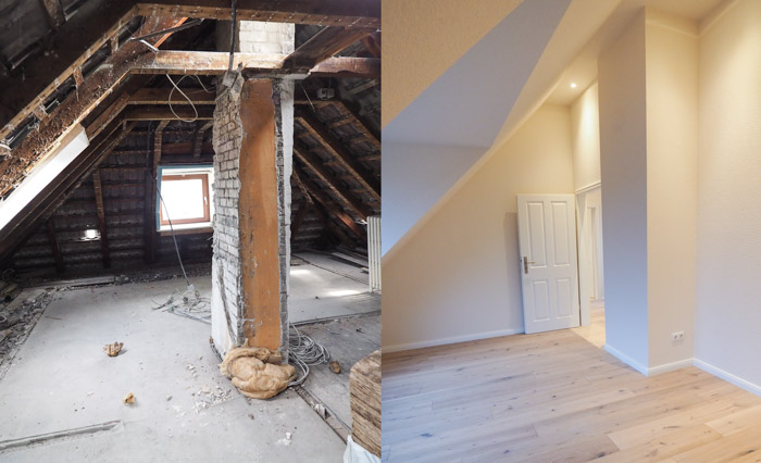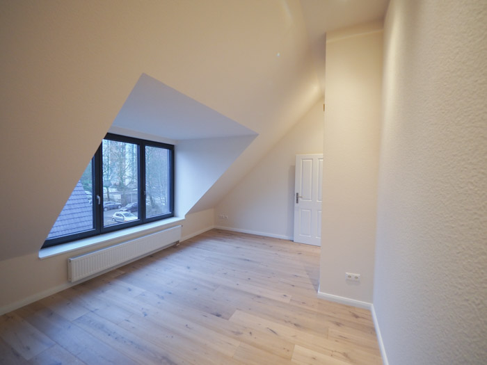 UmbauProjektart: Das ursprüngliche Walmdach wurde durch einen neuen Dachstuhl mit einer steileren Dachneigung ersetzt, um dadurch eine bessere Raumhöhe zu erlangen. Durch den Einbau von zwei Dachgauben ließ sich die nutzbare Wohnfläche vergrößern.